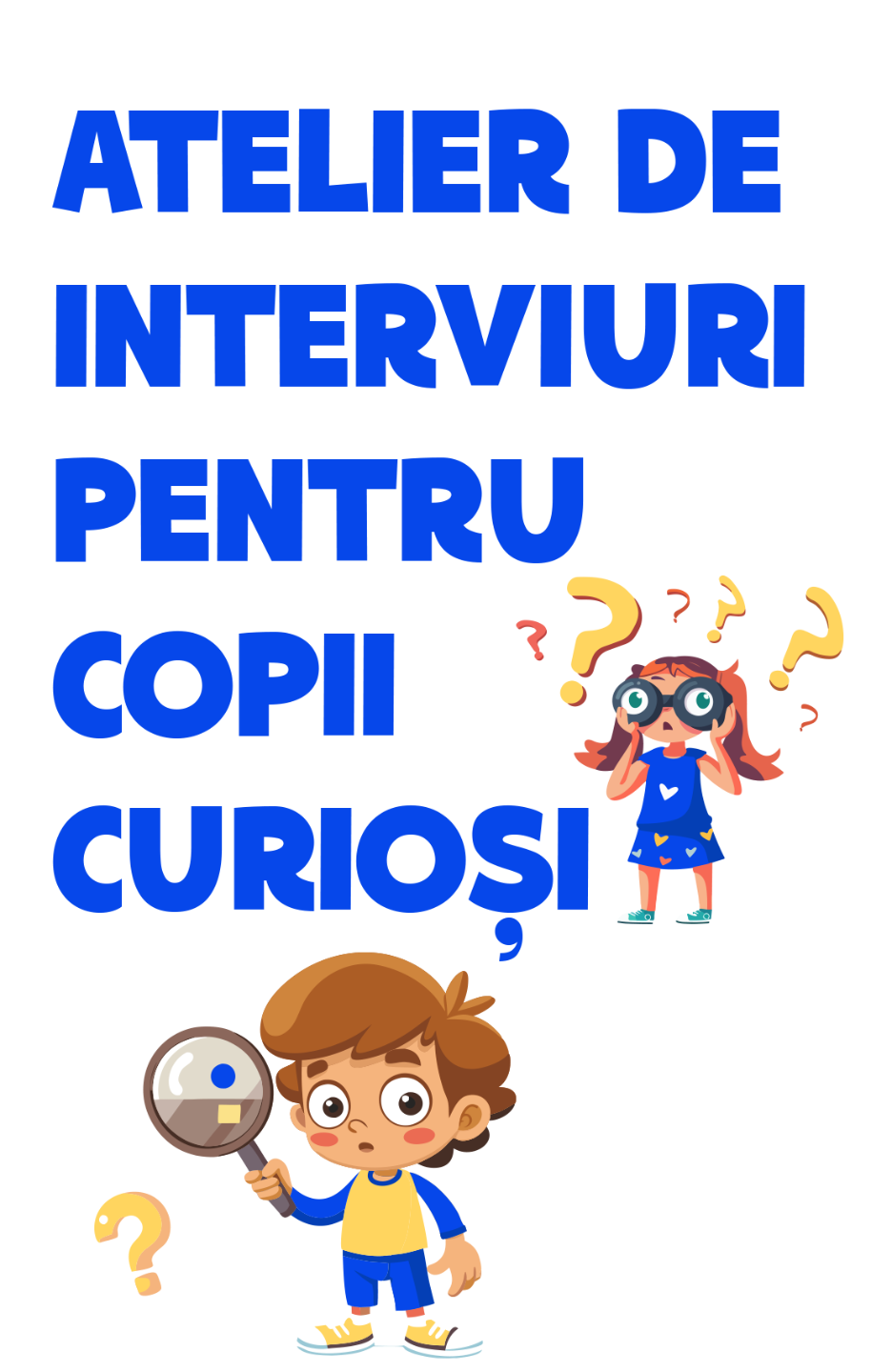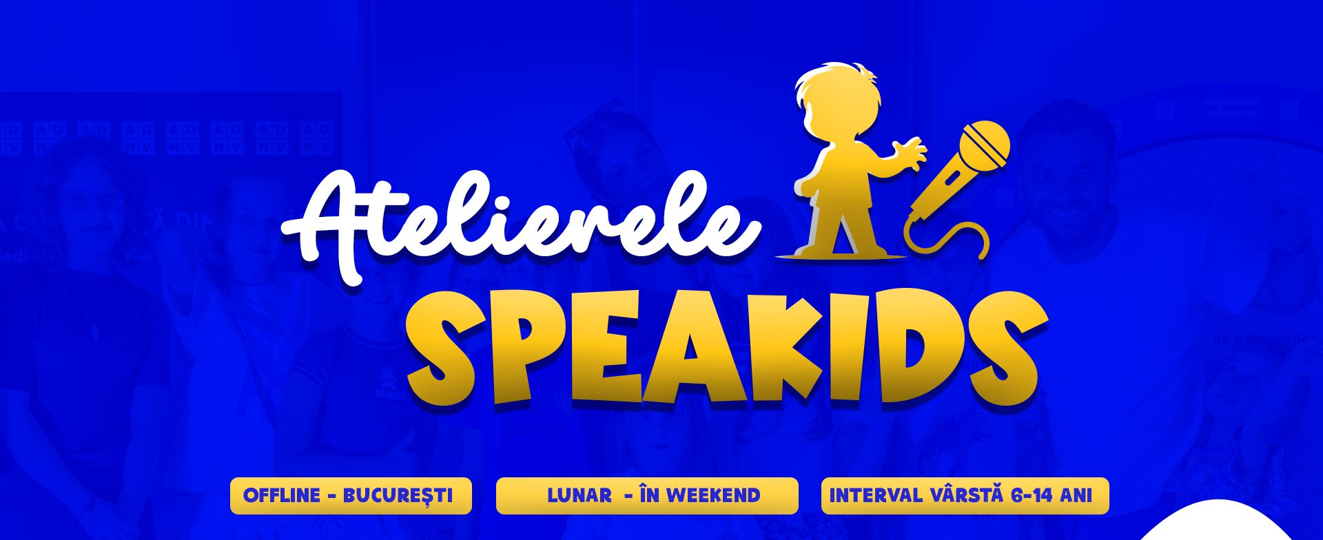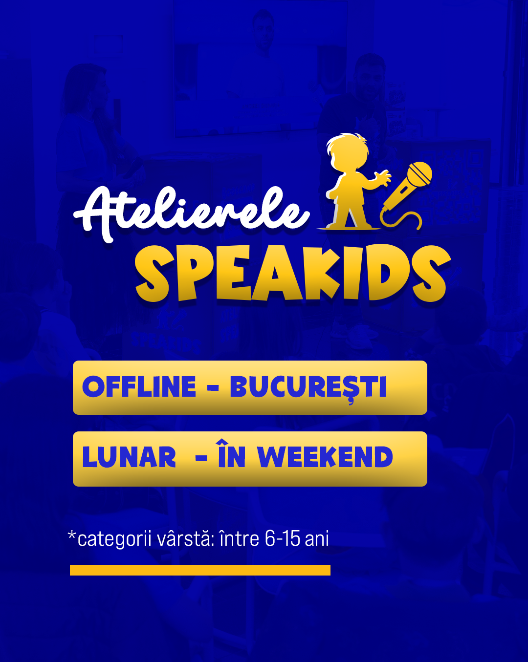 Un atelier plin de energie și creativitate. Copiii vor descoperi minunata lume a improvizației! Sub îndrumarea unui trainer pasionat, cei mici vor explora tehnici de improvizație și vor învăța să-și folosească imaginația pentru a crea povești fascinante și amuzante pe loc. Prin jocuri de improvizație și activități distractive, copiii vor exersa abilitățile de vorbire în public și vor dezvolta încrederea în sine.